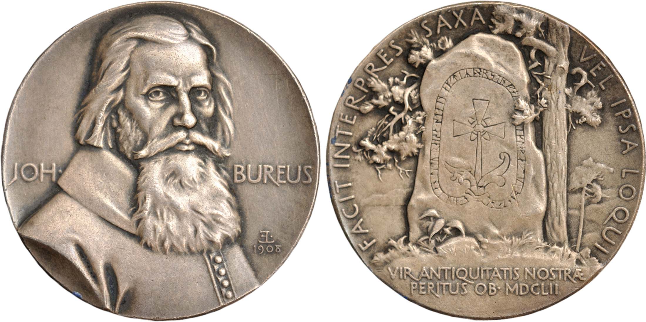 På åtsidan visas porträttet av Johannes Bureus. Som förlaga har Erik Lindberg använt en målning från 1627 där den 59-årige Bureus finns avporträtterad. På medaljen omges porträttet av texten JOH. - BUREUS. Nere till höger har Erik Lindberg signerat medaljen med EL i ligatur (E i retrograd) samt 1908.