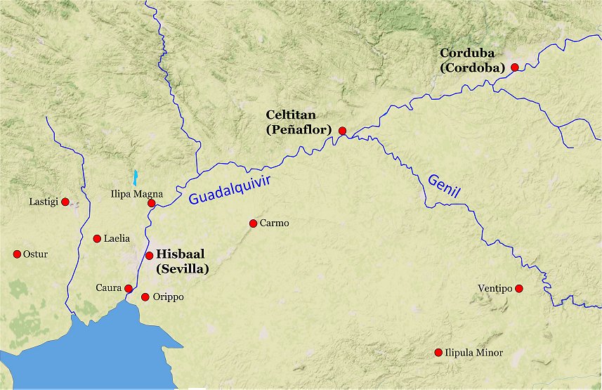 Del av Andalusien under andra århundradet f.v.t. med staden Celtitan/Celtitanum (dagens Peñaflor) vid floden Guadalquivir.