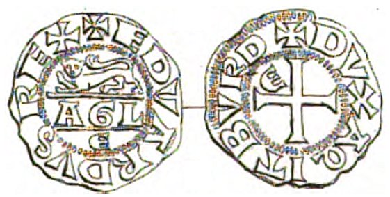 Se frånsidan på myntet. Observera att den engelske kungen kallade sig hertig av Akvitanien och Bordeaux. Akvitanien var en engelsk besittning fram till år 1422 och Bordeaux tillhörde England ända till år 1453.
