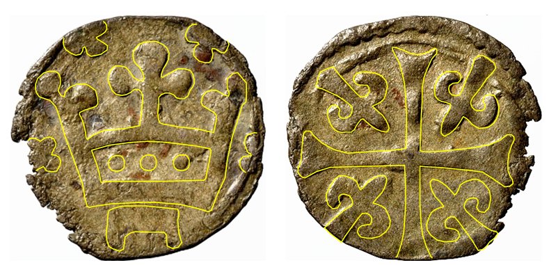 | Åtsida: | En kunglig krona omgiven av bitecken. | Frånsida: | Ett stort kors. I varje korsvinkel är det en symbol som liknar en förenklad fransk lilja. |
