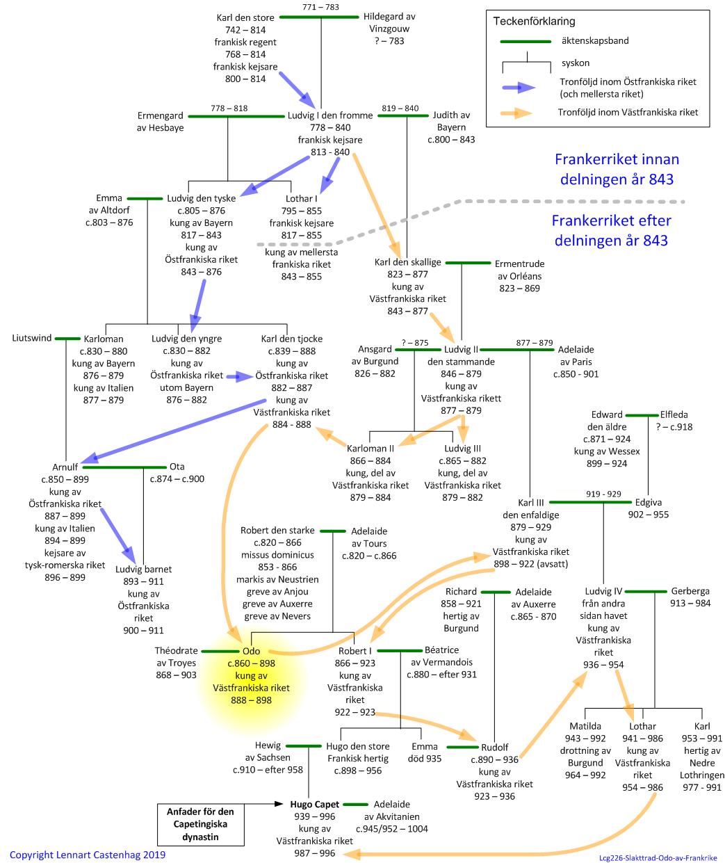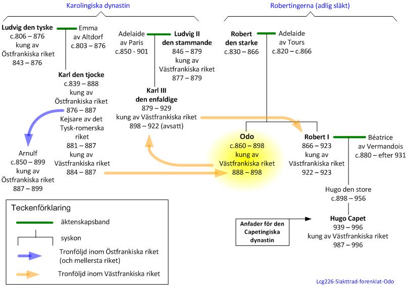 Den tjugofemårige Odo[2], allmänt benämnd "greven av Paris" visade sig ha bättre handlag med plågoandarna. Han lyckades stå emot vikingarnas belägring av Paris 885-886, och när Karl den tjocke gick ur tiden år 888 valdes han till Västfrankiska rikets kung. Därmed hade raden av härskare av den karolingiska dynastin brutits i Västfrankiska riket.