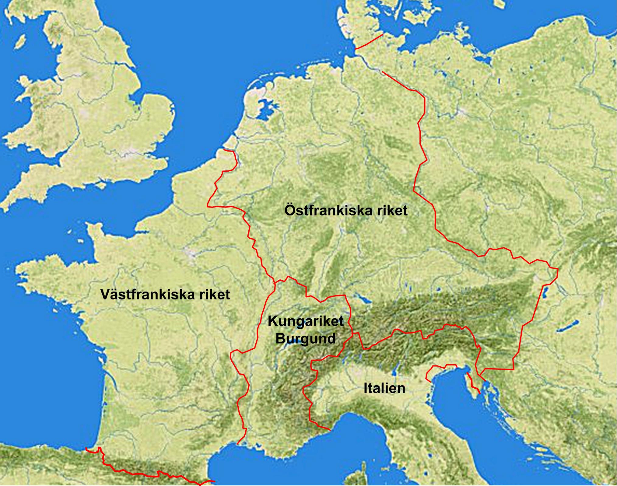 Det Frankiska riket var delat i ett västligt och ett östligt kungadöme år 888.