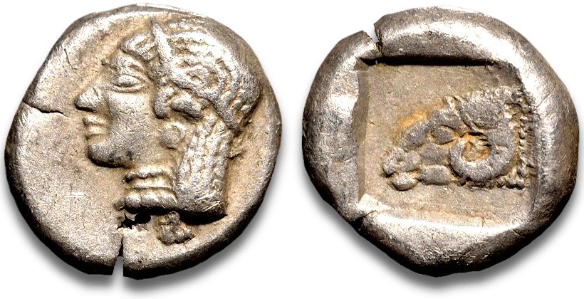 På åtsidan visas huvudet av en kvinna i profil vänd åt vänster. Hon är avbildad i arkaisk stil vilket kännetecknas av att hennes öga visas framifrån trots att kvinnan i övrigt visas i profil. På frånsidan visas huvudet av en bagge vänd åt vänster inom en incuse-kvadrat.