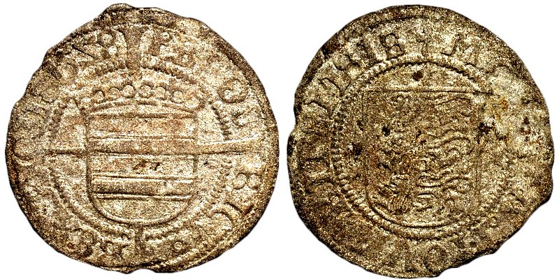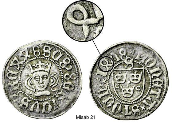 Det händer ibland att denna underliga symbol dyker upp i årtal på äldre mynt som siffran 4. Se nedanstående örtug 1478 från Sten Sture d.ä. som för övrigt är Sveriges första mynt med årtal.