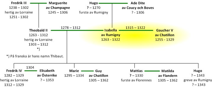 I grevskapet Namur låg bland annat städerna Florennes och Yves. Thibaut II, som var hertig av Lorraine under åren 1303-1312, hade fått Florennes i förläning och han hade där rätt att slå mynt i eget namn liksom i Yves. Thibaut var gift med Isabelle de Rumigny men han avled år 1312 vilket innebar att Isabelle ärvde Florennes. Strax efter makens död gifte hon om sig med Gaucher V de Chatillon varpå mynträtten i Florennes och Yves överfördes på honom. Gaucher V var samtida med drottning Blanche.