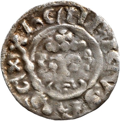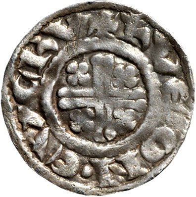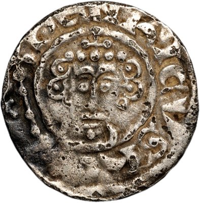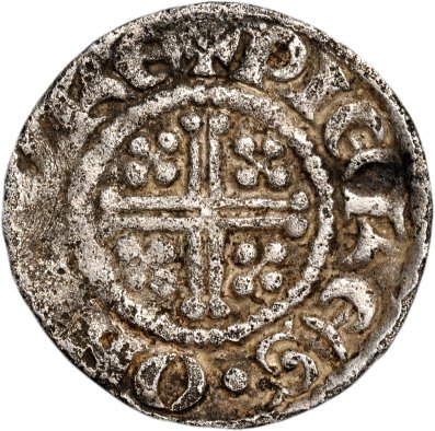 | Frånsida + RAVL ON LVNDE Raul myntmästare i London | Frånsida + HVE ON EVCRV [2] Hue myntmästare i York | Frånsida + PIERES ON DVRE Pieres myntmästare i Durham |