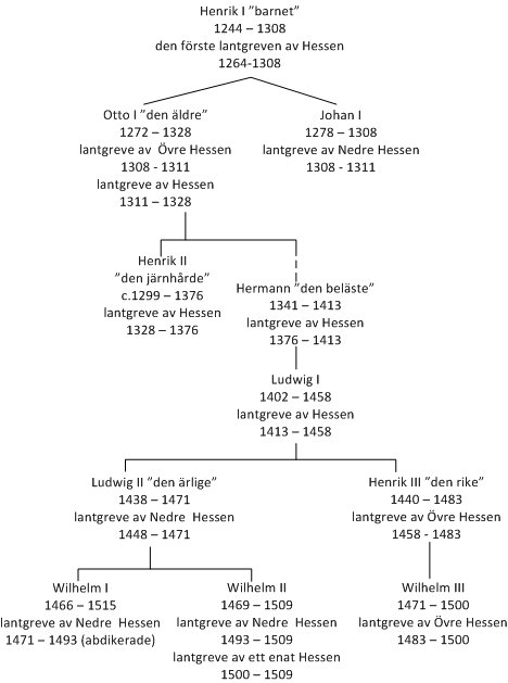Efter det att Henrik I gick ur tiden år 1308 delades Hessen i Oberhessen (den södra delen) och Niederhessen (den norra delen), men år 1311 blev Hessen åter ett enat lantgrevskap. I mitten av 1400-talet var det åter dags för delning eftersom grevefamiljens söner ville ha varsin del att styra över, men år 1500 var Hessen åter enat.