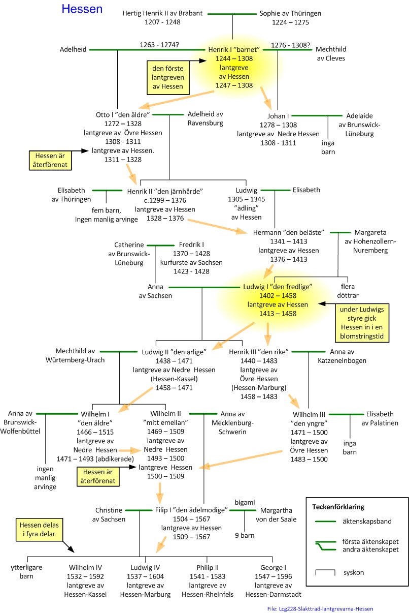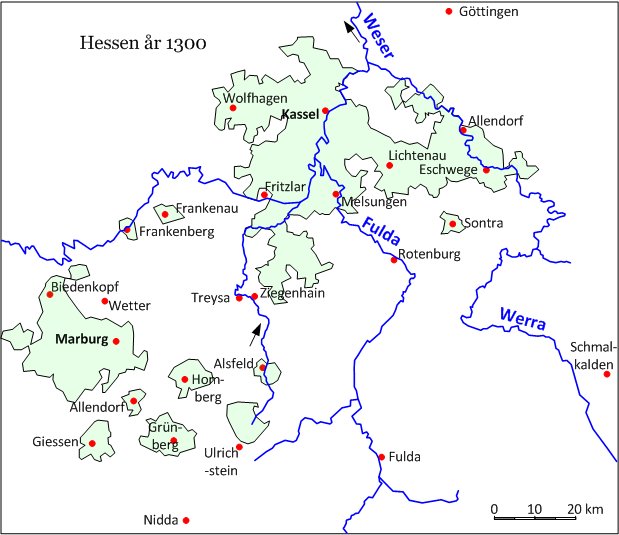 Grevskapet Hessen, vars namn ursprungligen härstammar från hessarna, som var en frankisk folkgrupp, var ursprungligen en del av det tyska lantgrevskapet Thüringen. Efter lantgreve Henrik Raspes död år 1247 utbröt maktstrider som slutade med att grevskapet Hessen bröts loss och blev ett eget lantgrevskap. Det kvarvarande Thüringen sammanfördes med markgrevskapet Meissen under markgreven Henrik III "den upplyste" av Meissen[1]. Det är om det medeltida Hessen denna berättelse kommer att handla.