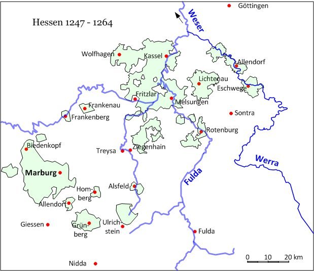 I mitten av 1200-talet var Hessen inte ett sammanhängande landområde i geografisk mening. Hessen bestod snarare av ett antal utspridda markområden som sinsemellan endast undantagsvis hade kontakt med varandra.
