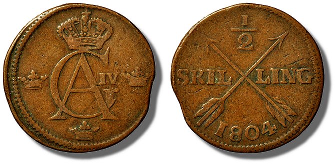 Att myntet från 1804 är från Avesta framgår tydligt om man betraktar kungakronan.