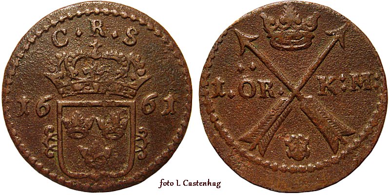 1 öre KM 1661. I sällsynta fall omges kronan av romber. Foto: Misab. Ref SM --.
