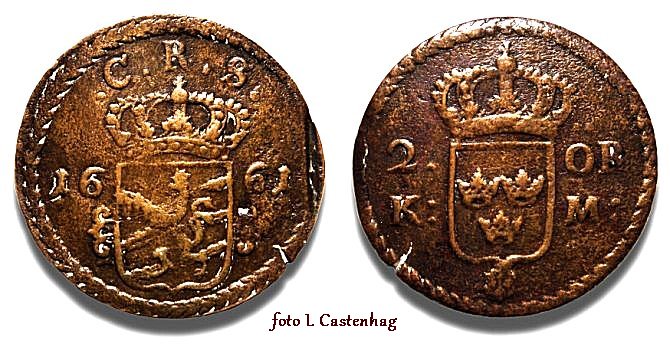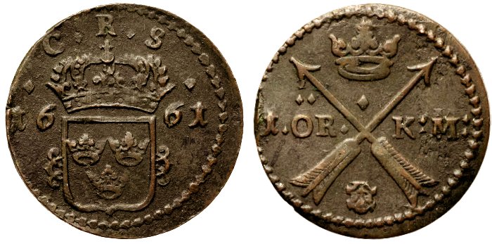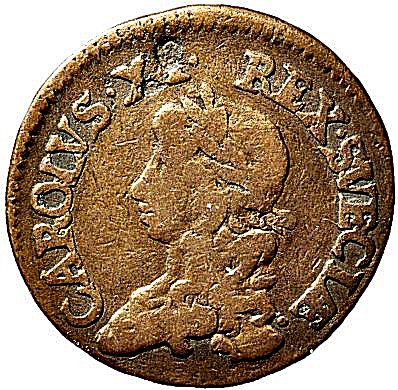 Det präglades stora mängder silvermynt för Karl XI. Här presenteras ett kopparmynt som är präglat med originalstampar för silvermynt, och det skedde antagligen i myntverket i Stockholm. Det är naturligtvis inte ett reguljärt mynt även om stamparna är äkta, men det finns ingen myntordning till stöd för myntet, och av den anledningen är myntet en förfalskning.