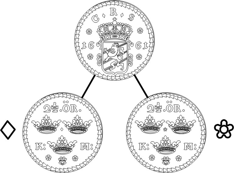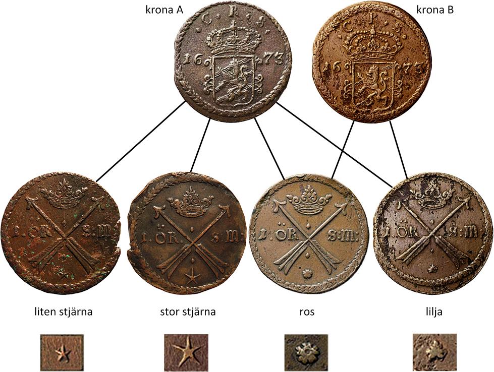 4 mark 1647 avslag i koppar vet vi nästan ingenting om, och vem som har graverat krona B på 1 öre SM 1673 är ännu så länge en öppen fråga i den här berättelsen.