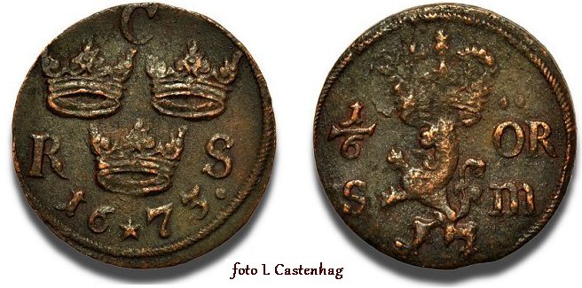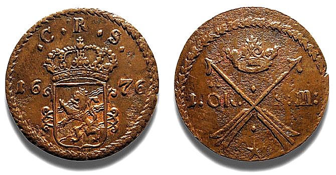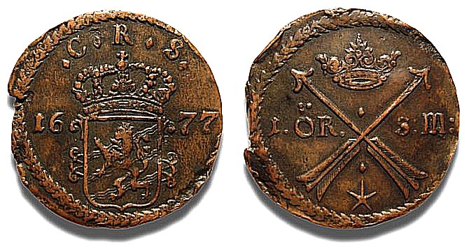 Längre ned på sidan kommer vi att försöka reda ut anledningen till att 1673 års kopparmynt finns i så avvikande utformning.