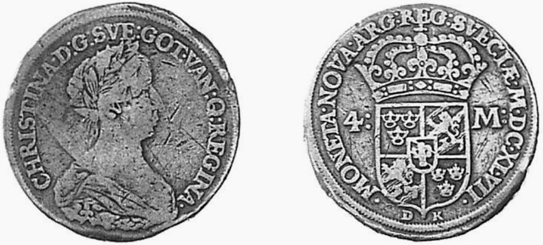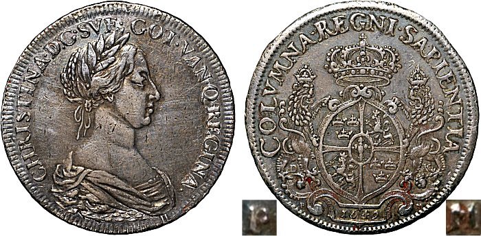 Hos Kungl. Myntkabinettet (KMK) finns ett avslag i koppar av en 4 mark 1647 som inte motsvaras av något av de kända silverexemplaren. Hemmingsson har skrivit om detta märkliga avslag i SNT 2000:4. Titta på frånsidans krona. Känns den igen?