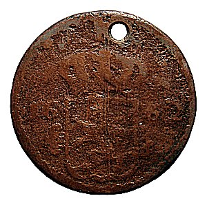 2 öre KM har ett format som gör den väl lämpad att bäras som medaljong. Det exemplar som här presenteras är hårt nedslitet. Huruvida slitaget uppstod under den tid då objektet cirkulerade som mynt eller under användningen som medaljong går inte att fastställa.