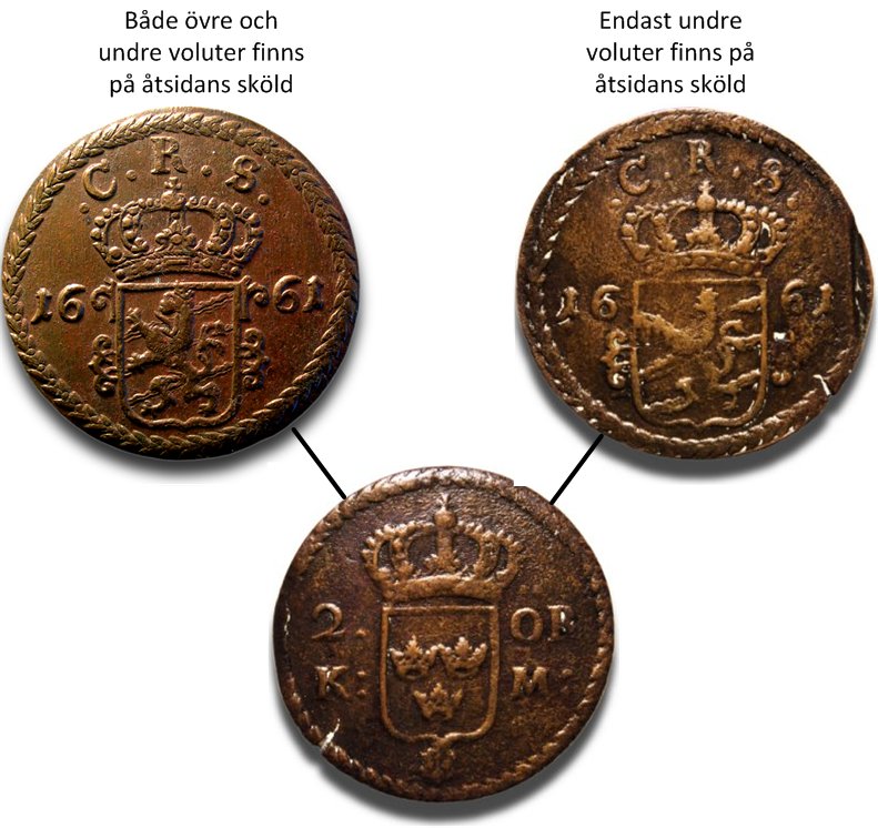 De övre voluterna på åtsidans sköld saknas ibland på 2 öre KM 1661. Ref: SM 330a resp. 330b.