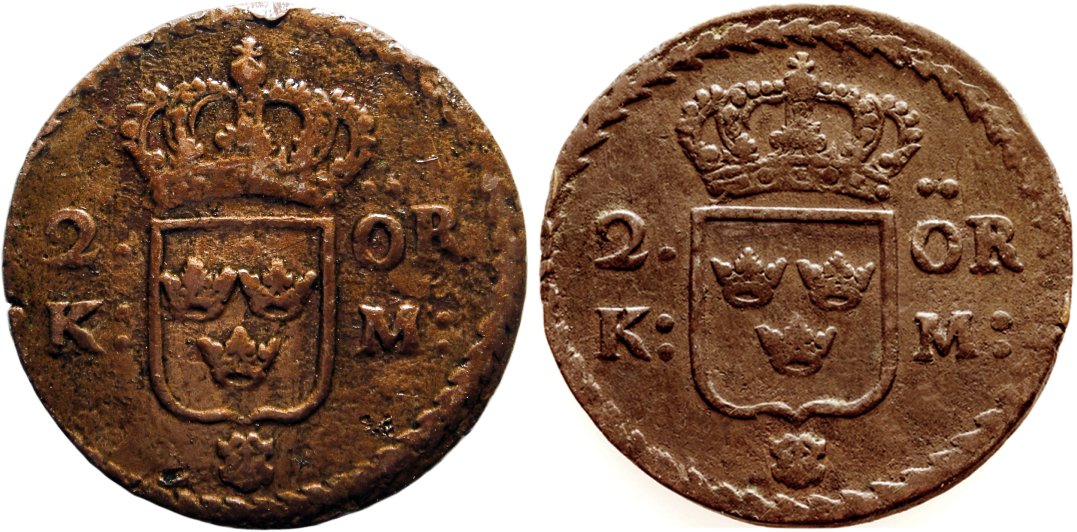 Ett öre SM 1673 finns med två åtsidor vars kronor är av helt olika utseende.
