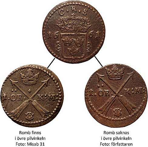 1 öre KM 1661 saknar ibland romben i frånsidans övre pilvinkel,