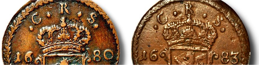 Kronorna på Karl XI:s kopparmynt är mycket detaljrika. Det är därför inte så lätt att se alla detaljer på kungakronan och sveakronorna. Endast på mynt med mycket god präglingskvalitet och hög konserveringsgrad går det att se detaljerna.