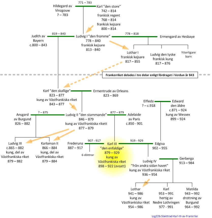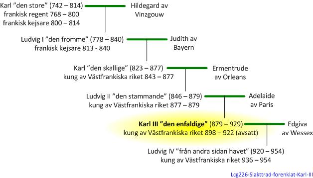 År 879 dog den västfrankiske kungen Ludvig II "den stammande". Hans hustru Adelaide var då gravid. Efter en tid födde hon sonen Karl som sedermera blev Karl III och kom att kallas "den enfaldige". Karl den store var farfars farfar till Karl III.