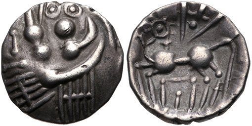 På åtsidan visas ett stiliserat huvud vänt åt vänster.