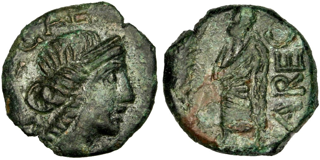 Åtsidan visar bilden av ett kvinnohuvud vänt sig åt höger.