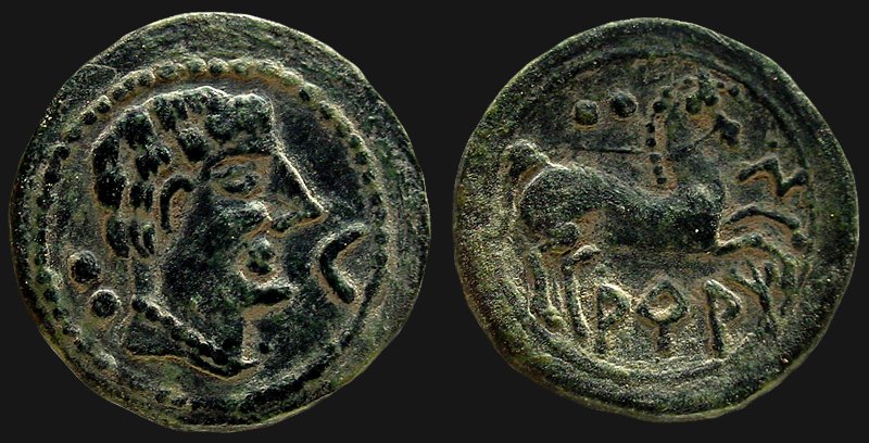 På frånsidan en häst utan ryttare. Över hästen är det två punkter och under hästen står det ARATiS med keltiberiska runor. |