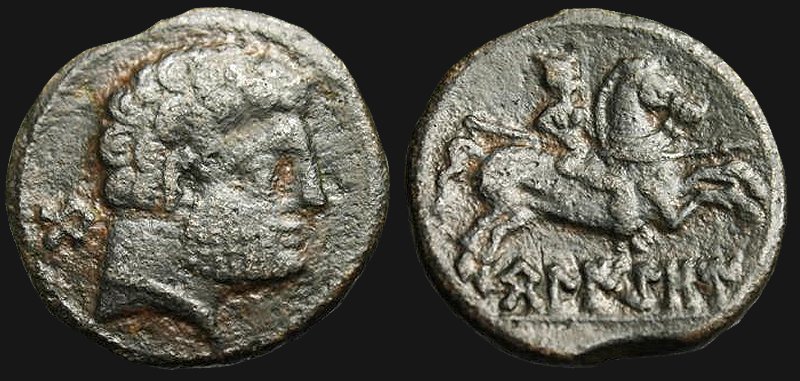 På frånsidan en ryttare till häst i full galopp med en lans redo till strid. Under hästen står det BeLIGiOM med keltiberiska runor. |