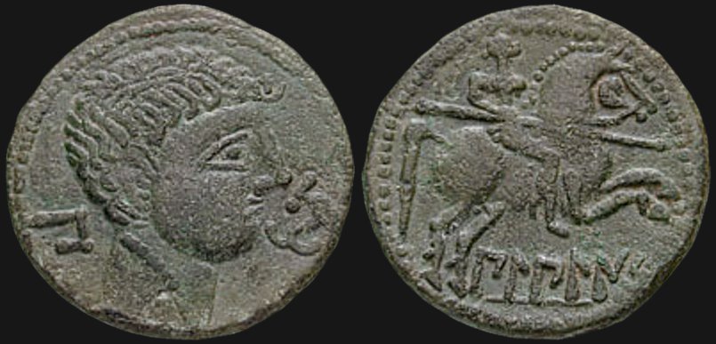 På frånsidan en ryttare till häst i full galopp med en lans redo till strid. Under hästen står det BiLBiLIS med keltiberiska runor. |