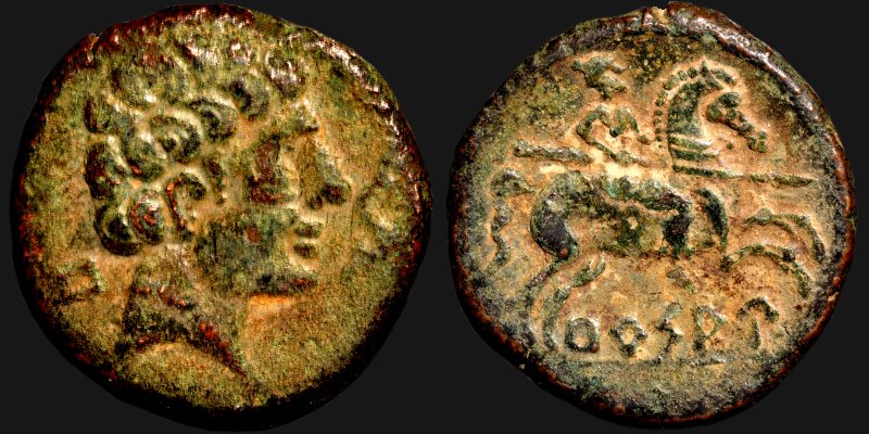 På frånsidan är det en ryttare till häst i full gallopp med lansen redo för strid. Under hästen står det BuRSAU med keltiberiska runor. |