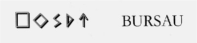 På åtsidan ett manshuvud vänt åt höger. Framför huvudet är det en delfin. Bakom huvudet är det en kvadrat, dvs tecknet Bu. |