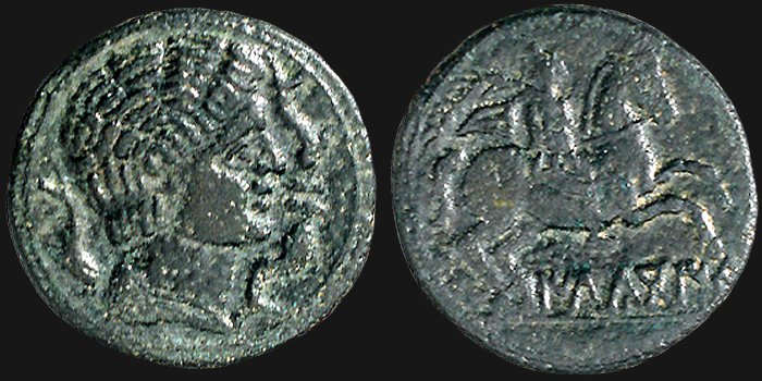 På frånsidan en ryttare till häst i full galopp. Ryttaren har en palmkvist över axeln, och han har en mantel som fladdrar för vinden. Under hästen står det ILDuCoITe med keltiberiska runor. |