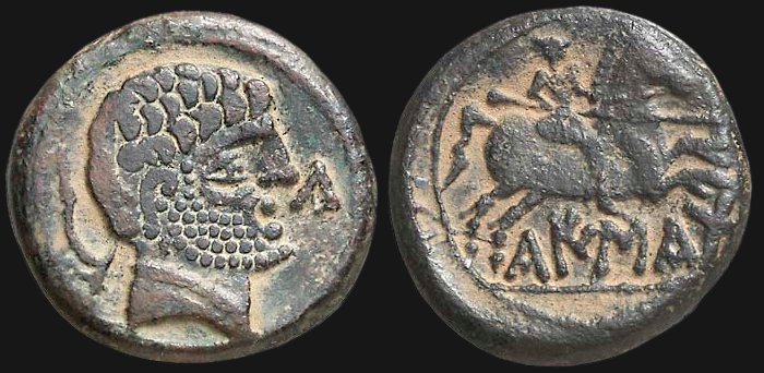 På frånsidan en ryttare till häst i full galopp med en lans redo till strid. Under hästen står det CaISCaTa med keltiberiska runor. |