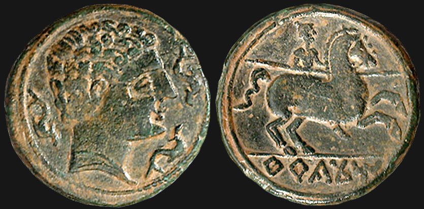 På frånsidan en ryttare till häst i full galopp. Ryttaren håller en lans redo för strid. Under hästen står det TeRCaCoM med keltiberiska runor. |