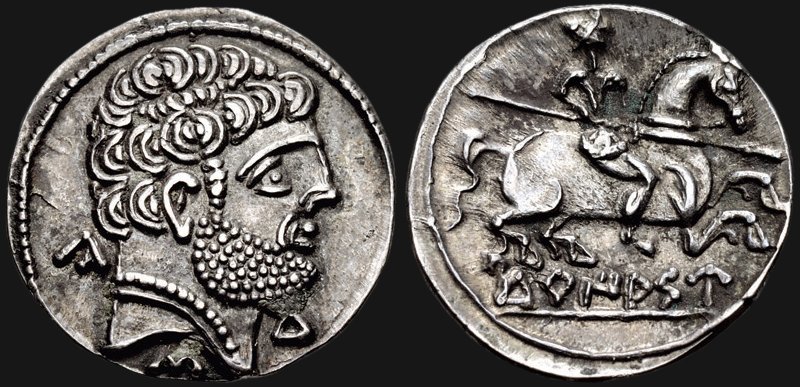 På frånsidan en ryttare till häst i full galopp. Ryttaren håller en lans redo för strid. Under hästen står det TuRIASU med keltiberiska runor. |