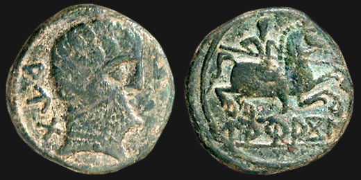 På åtsidan ett skäggigt manshuvud vänt åt höger. Bakom huvudet finns texten AUDa med keltiberiska runor. |