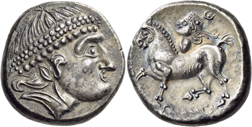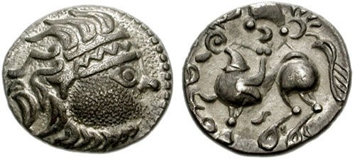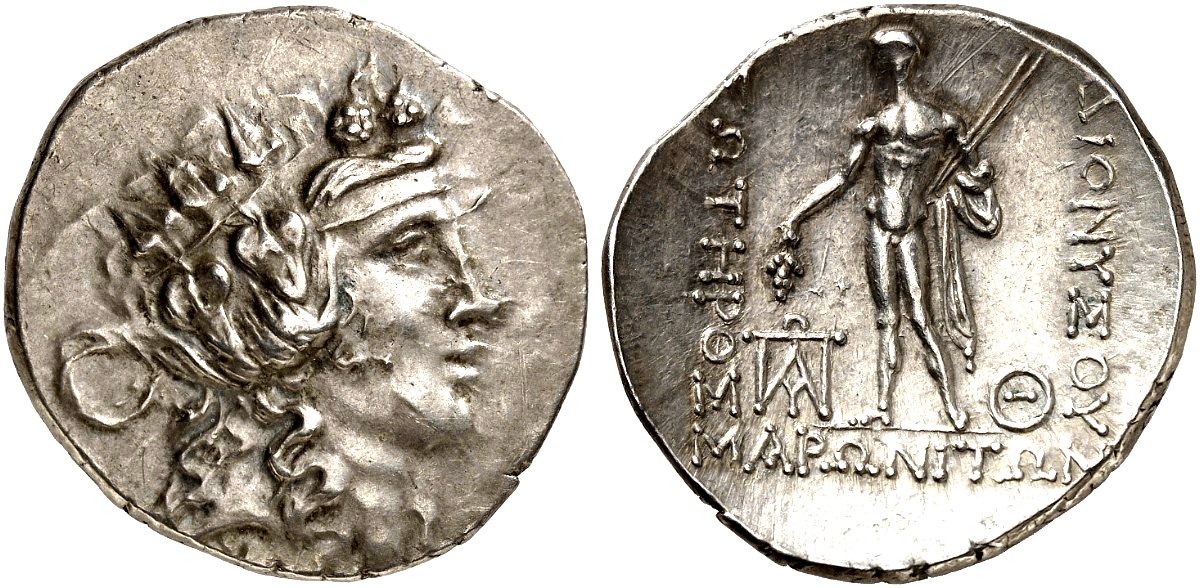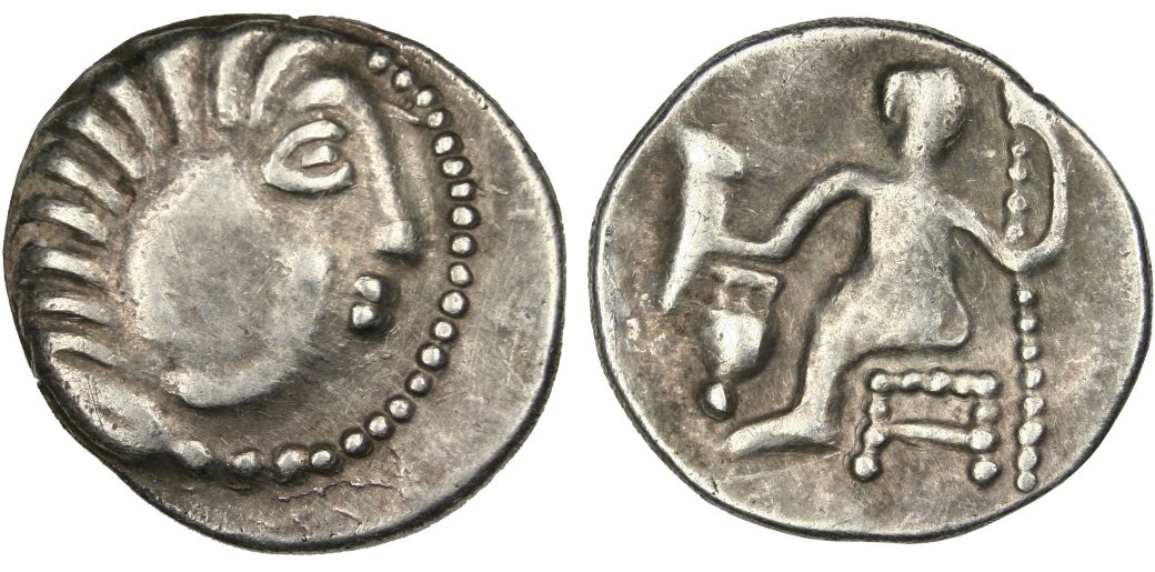 | Som jämförelse: AR tetradrakm ca 189-45 f.v.t. Maroneia. Vikt 16,20 g. Ref: Sear 1635. På åtsidan ser vi den unge Dionysos huvud. På frånsidan ser vi Dionysos som i höger hand håller en druvklase och i vänster hand håller två stänger. Keltiska imitationer av detta mynt liksom motsvarande från Thasos var vanligen förekommande enligt Sear. Foto: Paul-Francis Jacquier |