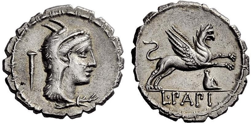| Som jämförelse: Romersk AR denarius år 79 f.v.t. präglad av L Papius Serratus. Diameter ca 19 mm och vikt 3,80 g. På åtsidan visas Juno Sospitas porträtt. På frånsidan visas en grip samt under avskärningen namnförkortningen L PAPI. Ref: Sear 311. Foto: icollector.com |