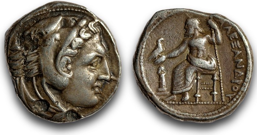 Som jämförelse visas här en tetradrakm i silver (fyra drakmer), slagen för Alexander den store.