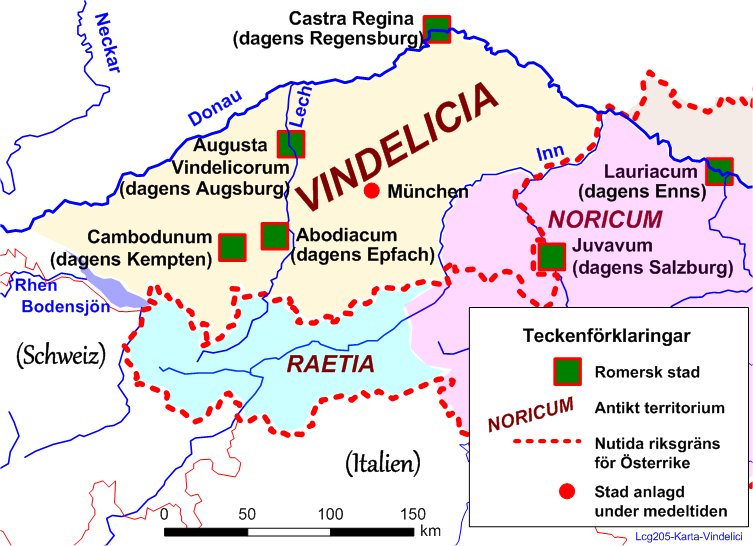 På kartan har den den romerska befästningen Augusta Vindelicourm ritats in.