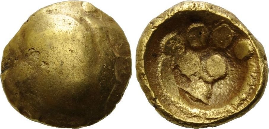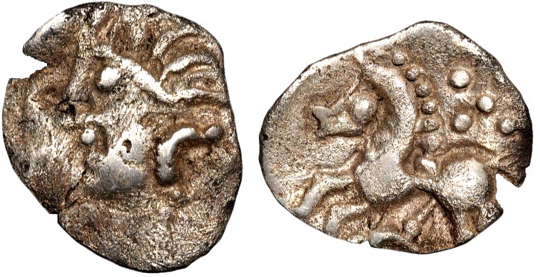 Litet silvermynt från första århundradet f.v.t. Vikt 0,295 g. Storlek 8,2 x 9,8 mm.