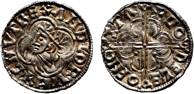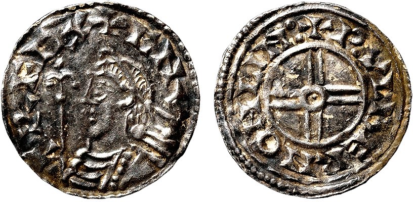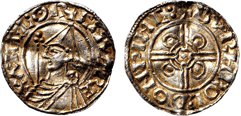 Sven Tveskägg utropade sig till kung över England, men hans tid som engelsk regent blev inte långvarig. På grund av sjukdom avled han år 1014 och Ethelred II kunde återta sitt kungarike. | ![]() Penny 978−1016, Ethelred II, Myntort: London Myntmästare: Leofwine Ref: SCBC 1151 Omskrift: +AEDELRED REX ANGLO |