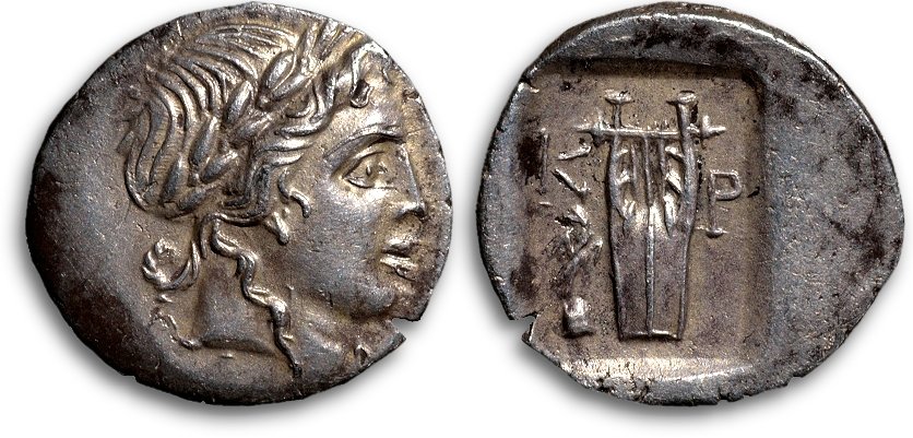 | Åts: | Apollo i profil, vänd åt höger. På ömse sidor om halsen på Apollo bokstäverna Λ Υ, dvs ΛYKAIΩN. Dessa syns dåligt på detta ex. | Frs: | En kithara [3] som omges av de grekiska bokstäverna Κ Ρ vilka står för Kragos. Till vänster om kitharan (under K) står en örn på en omphalos [4]. |