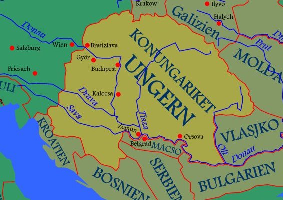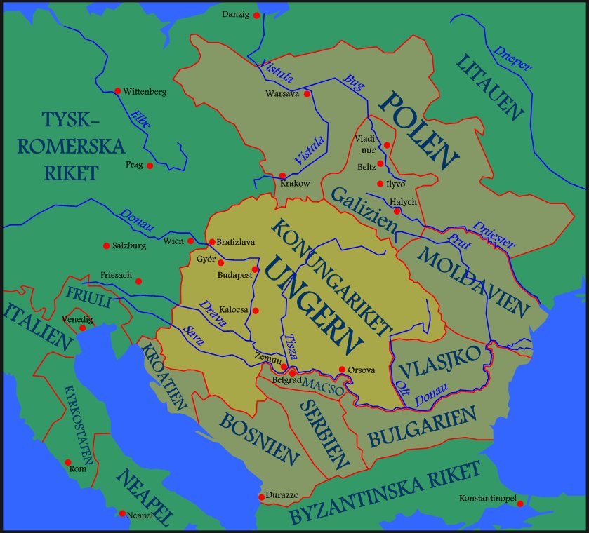 Nedan visas ett utsnitt av europakartan från Ludvig I:s tid som visar att det fanns ett antal lydriken under den ungerske kungen. Imperiet sträckte sig sålunda från Adriatiska havet till Svarta havet.