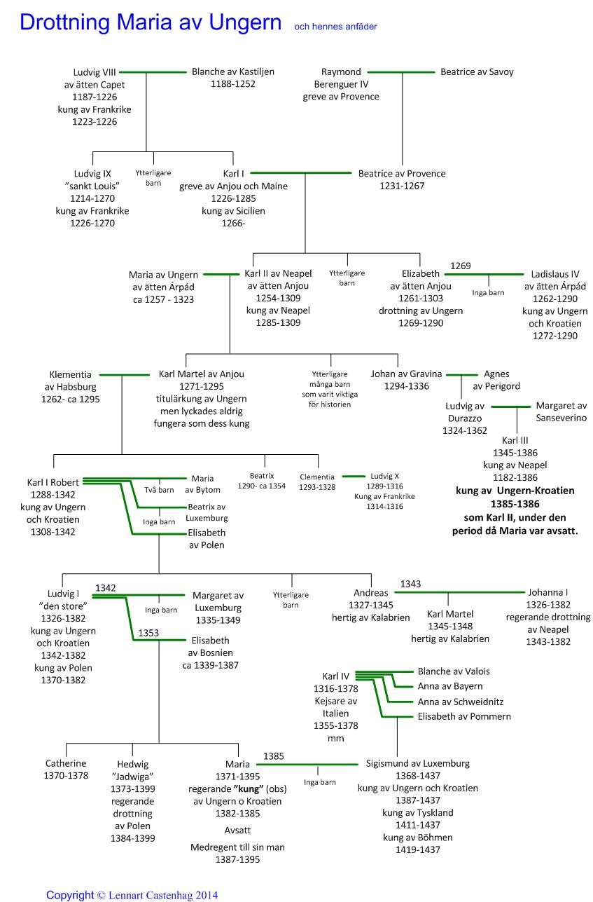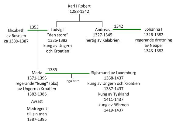 Av diagrammet framgår också att Johanna av Neapel under en kort tid var gift med Marias farbror. Det var Johanna som blev mördad av Karl III.