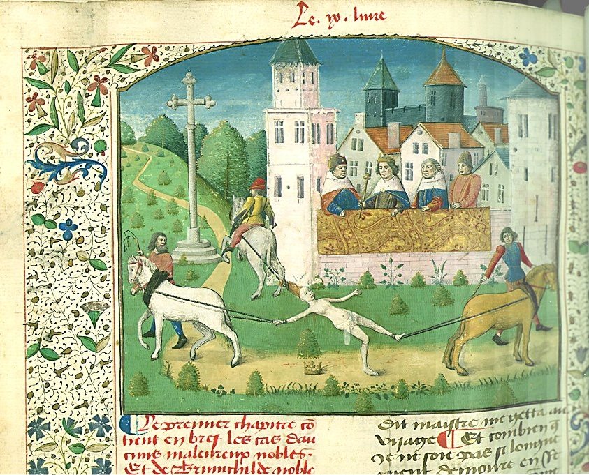 Avrättningen av Brunhild enligt en illustration i De Casibus Virorum Illustrium, från 1475.