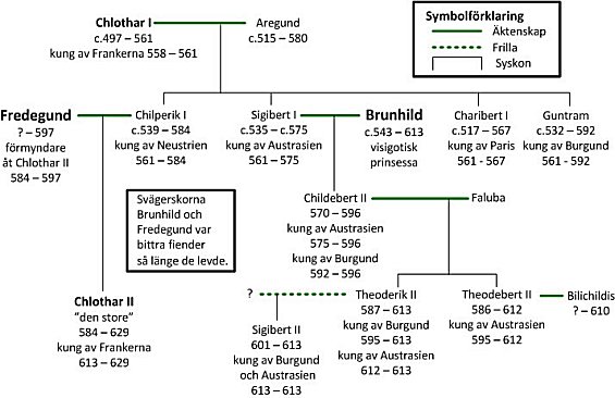 Den merovingiska ätten från Chlotar I till Chlothar II (förenklad framställning).