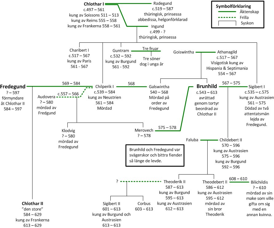 Chlothar I:s fyra söner delade upp det merovingiska Frankerriket mellan sig. Bittra fejder inom släkten uppstod med de bägge svägerskorna Brunhild och Fredegund i centrum. Brunhild har särskilt intresserat eftervärlden som en maktkvinna med hårda nypor. Hon har också varit förebild för Wagners valkyria Brünnhilde i hans musikdramatiska verk Nibelungens ring.