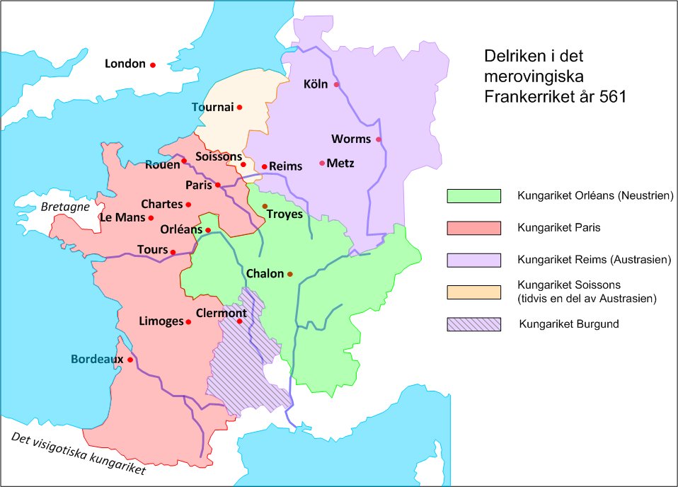 År 511 gick Klodvig I ur tiden och sönerna tog vid inom sina respektive kungariken. År 558 hade alla sönerna avlidit utom Chlotar I som därmed blev kung över hela det merovingiska Frankerriket.